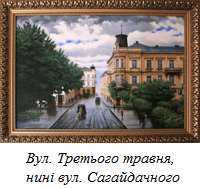 Навпроти кав′ярні на першому поверсі був м′ясний магазин, над ним — фотосалон. Цей дім добре видно на іншому полотні, де зображено початок вулиці — красивої, гамірної, по обидва боки «обтиканої» різноманітними крамничками, конторками, складами тощо.