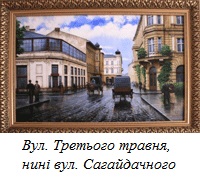 Нині універмаг розташований на головній вулиці Тернополя — Руській, а наприкінці XІX — на початку XX століть головною магістраллю в місті була вулиця, що носить нині назву Гетьмана Сагайдачного. Вона цікава тим, що сполучає два центральних майдани міста — Театральний і Волі. Її затишні куточки, майже суцільні ряди старих кам’яних будиночків із гарно оздобленими фасадами зображені на кількох картинах репрезентованої серії.